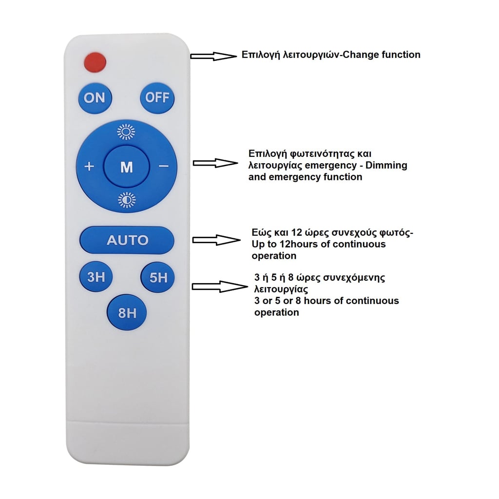 Με την χρήση του τηλεχειριστήριου, το οποίο συμπεριλαμβάνεται στην συσκευασία, καθορίζεται η ένταση της φωτεινότητας και οι ώρες συνεχόμενης λειτουργίας.