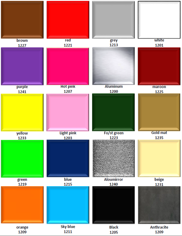 Χρώμα –αλουμίνιο ανοδιωμένο και σε 20 διαφορετικούς χρωματισμούς κατόπιν παραγγελίας